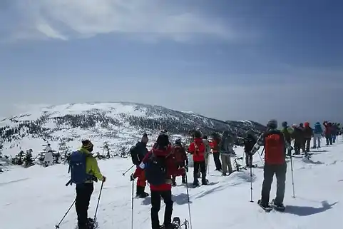 標高1,820mの北望台よりさらに標高1,964mの中大巓(なかだいてん)を歩くスノーシュートレッキング。美しい白銀の世界を望む本格冬山登山です。 |