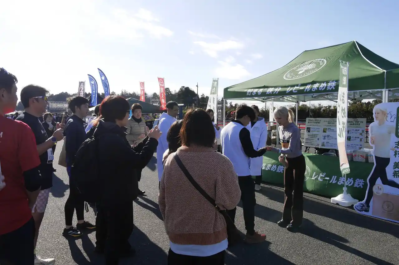 ブースではそのほか、「レピールまめ鉄」現品が当たる抽選企画も実施しました。出場ランナーに加え、ボランティアスタッフや応援に訪れた家族や友人の方々など、立場の異なる参加者も和気あいあいと楽しむ様子が見られました。 |