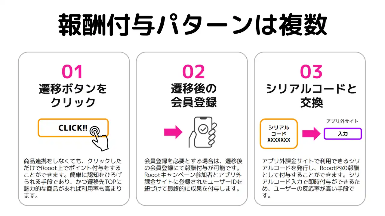「Rooot」を活用することで、単なる認知拡大に留まらず、「実際にアプリ外決済サービスを訪れ、アクセスさせる」という一連の行動を極めて効率的に実現可能です。 |