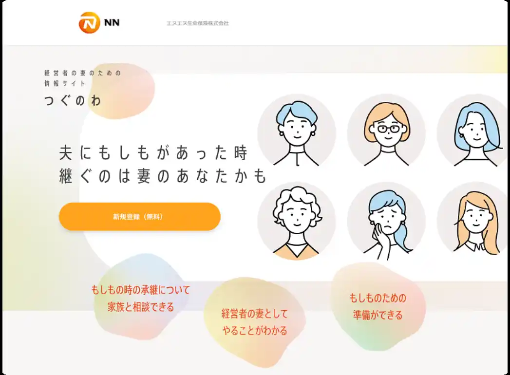 エヌエヌ生命は、中小企業サポーターとして「家族を守り、支えるサービス」を提供しています。その活動のなかで、夫の急な逝去に伴って、妻が夫の事業を突然承継することになり、悩み苦しんでいる状況を知りました。そこで、現経営者の突然の経営離脱・相続発生時における事前準備を促すことで中小企業の円滑な事業承継を支援すべく、「つぐのわ」を運営しています。全国15,000名以上※の中小企業経営者の妻が登録しており、一般社団法人緊急事業承継監査協会の伊勢田 篤史氏(弁護士)監修のもと、現経営者の突然の経営離脱・相続発生時における事前準備を促すことで中小企業の円滑な事業承継を支援しています。(※2025年12月末現在) |