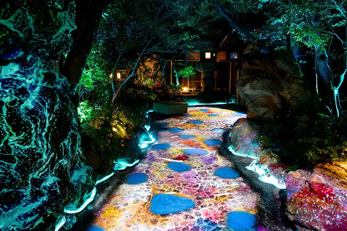つきじ治作は、昭和6年(1931年)に初代総料理長兼店主、本多次作により築地にて創業してから今日まで続く老舗高級料亭。800坪の敷地には四季の風情が楽しめる日本庭園が広がり、中央の池には滝が流れ、150匹を超える鯉が静かに泳ぎます。また池を取り囲むように意匠の異なる大小の座敷が配され、様々な方々が非日常のひとときを堪能されています。 初代店主・本多次作は食を通じて人を楽しませることに精通した、日本の美意識を心より大切にした人物でした。 その志は、味だけでなく空間から所作の隅々に至るまで現代に受け継がれています。 そんな95年という時の重なりのなかから今年、あらたなおもてなしとして、光と音が生み出す“もうひとつの治作の池”『澄池(すみいけ)』が誕生します。 昼は、自然音と一体となった音の重なりが、エントランス(空間)全体を包み込む。 夕暮れから夜にかけては、入口の岩や木々が深い黒や濃緑へと変化するその静謐な風景に、つきじ治作の象徴ともいえる池を見立て、池のゆらぎや鯉の気配を思わせる軌跡、来訪者に呼応して変化する光が、現実と幻想のあわいをそっと描き出すーー これまで支えてくださった方々の歩みと、これから出会う皆さまの時間を迎え入れながら、つきじ治作は次の100年へと歩みを進めます。 |