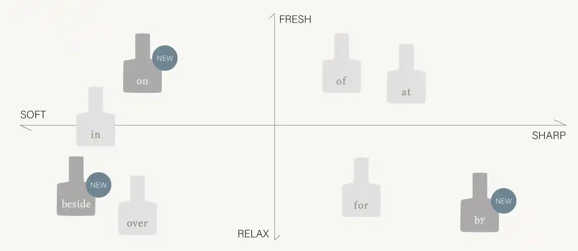 前置詞は時間や空間を切り取る言葉であり、香りは時間や空間の記憶とリンクするもの、という意図が込められています。 |