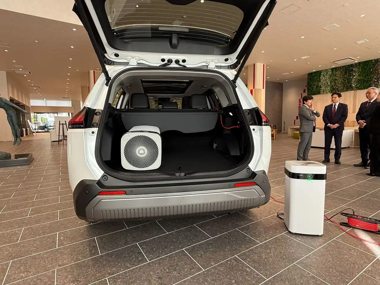 前左:鹿児島トヨタ株式会社 代表取締役社長 柳園久志氏、前右:株式会社エアドッグジャパン 代表取締役 柗浦好紀、後右:トヨタ給電車両「RAV4 Z(ハイブリッド車 E-Four)」、後左:空気清浄機「Airdog X5D」 |