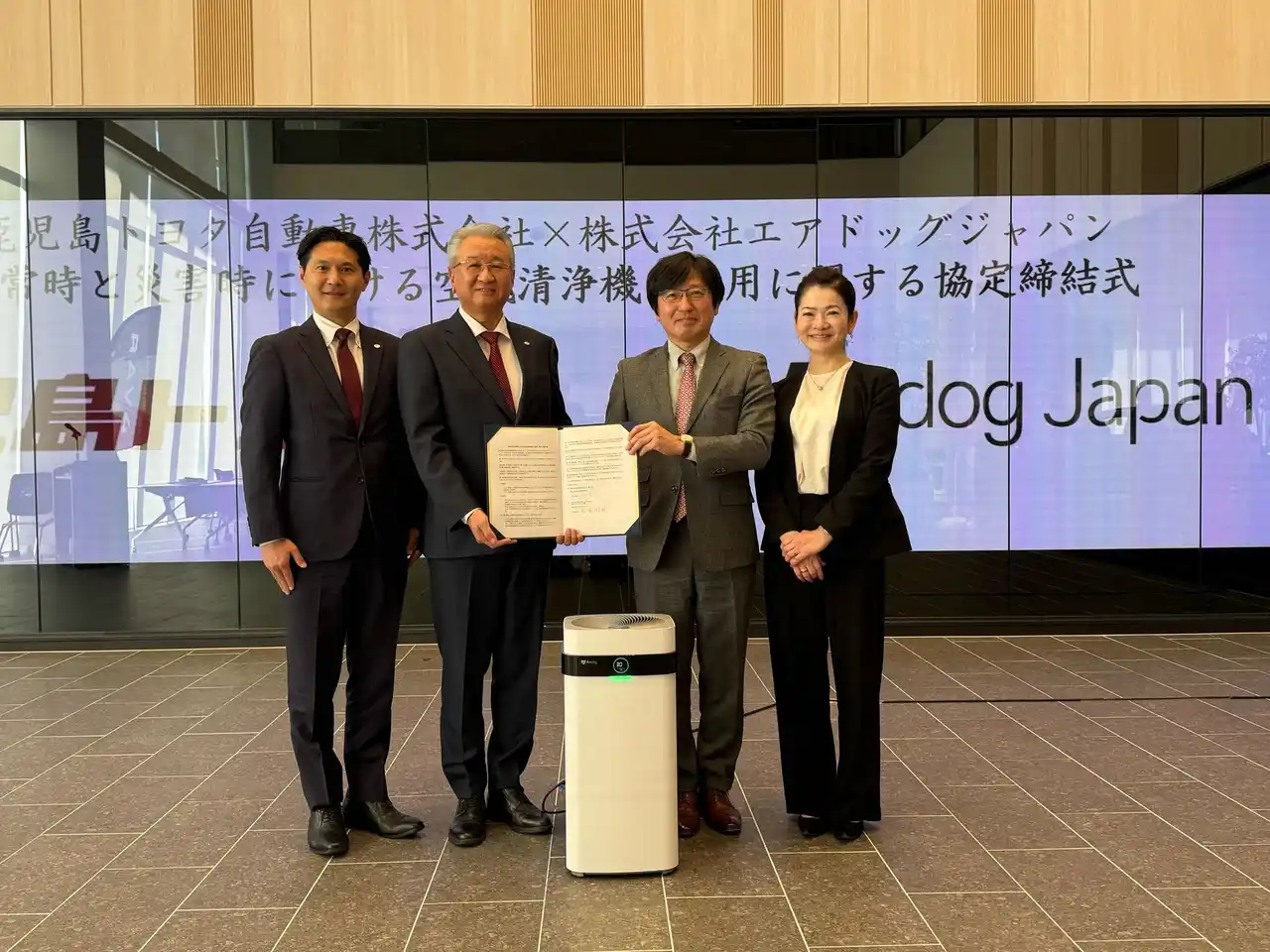 株式会社エアドッグジャパン(本社:東京都港区、代表取締役:柗浦好紀、北村重光、以下「エアドッグジャパン」)は、⿅児島トヨタ自動車株式会社(本社︓⿅児島県⿅児島市、代表取締役社長︓柳園久志、以下「鹿児島トヨタ」)と、平常時における店舗の環境改善と、災害時における良好な避難所環境の提供支援により「災害関連死」の防止を図る事を目的とした「平常時と災害時における空気清浄機の活用に関する協定」を1月20日に締結したことをお知らせいたします。 |