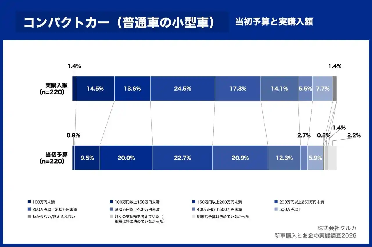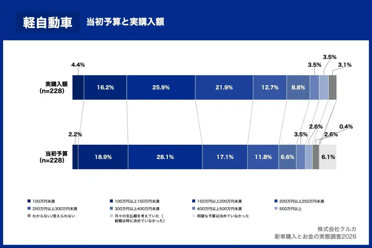 株式会社クルカは、直近3年以内(2022年1月以降)に新車を購入し、購入時の意思決定に関与した方 1,076名を対象に、新車購入とお金の実態調査2026を実施しましたので、お知らせいたします。本リリースでは、車のカテゴリ別に見た「当初予算と実際の購入額のズレ」を分析した結果をお知らせいたします。