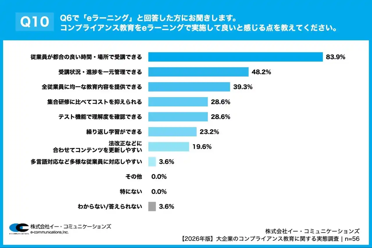 「Q10. Q6で「eラーニング」と回答した方にお聞きします。コンプライアンス教育をeラーニングで実施して良いと感じる点を教えてください。(複数回答)」
