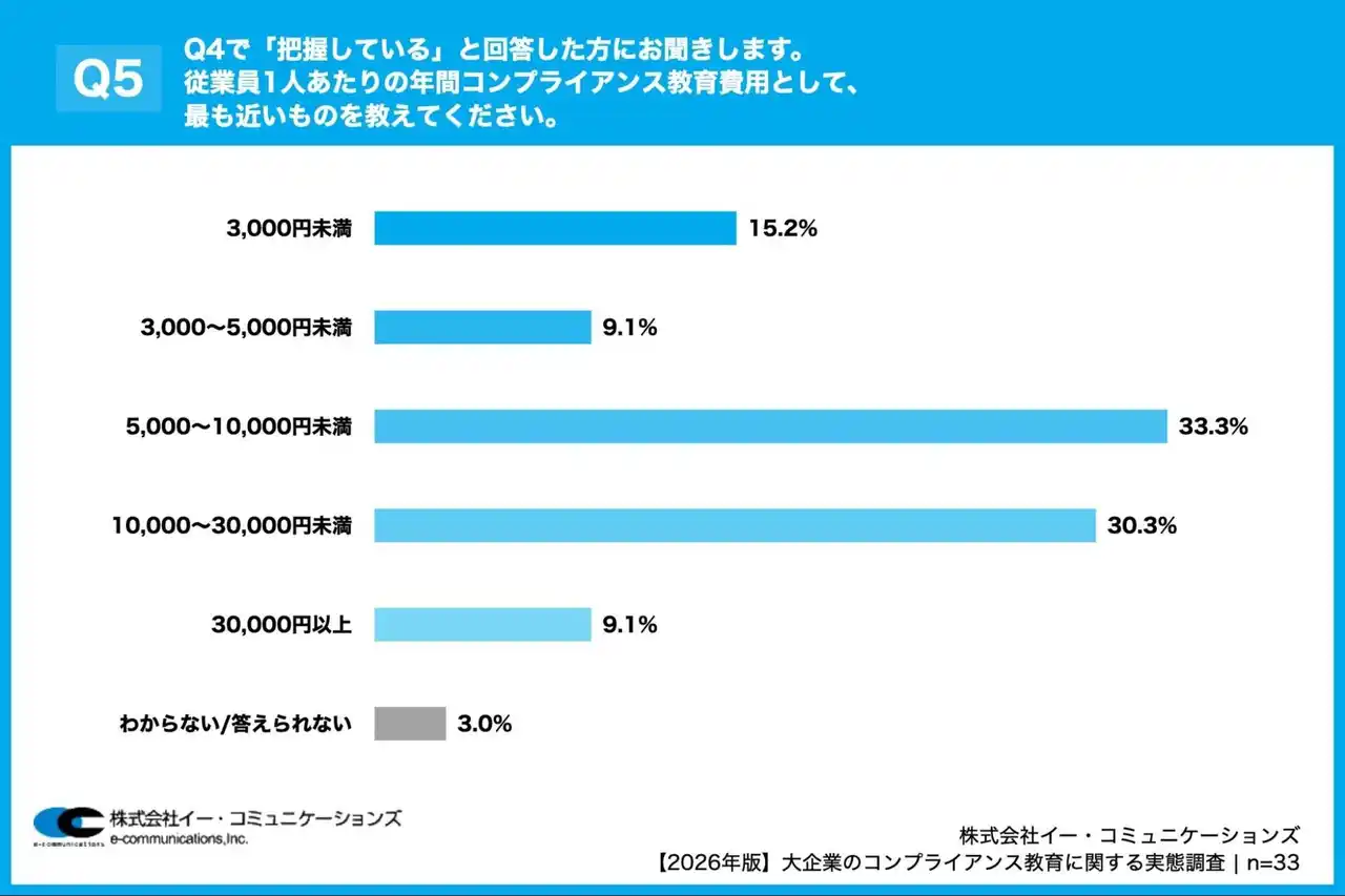 「Q5. Q4で「把握している」と回答した方にお聞きします。従業員1人あたりの年間コンプライアンス教育費用として、最も近いものを教えてください。」(n=33)と質問したところ、「5,000~10,000円未満」が33.3%、「10,000~30,000円未満」が30.3%という回答となりました。 |