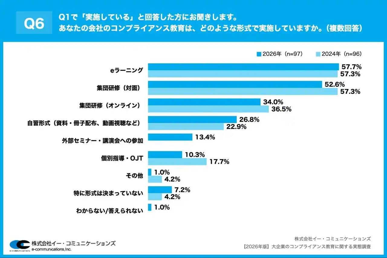 「Q6. Q1で「実施している」と回答した方にお聞きします。あなたの会社のコンプライアンス教育は、どのような形式で実施していますか。(複数回答)」(n=97)と質問したところ、「eラーニング」が57.7%、「集団研修(対面)」が52.6%、「集団研修(オンライン)」が34.0%という回答となりました。 |