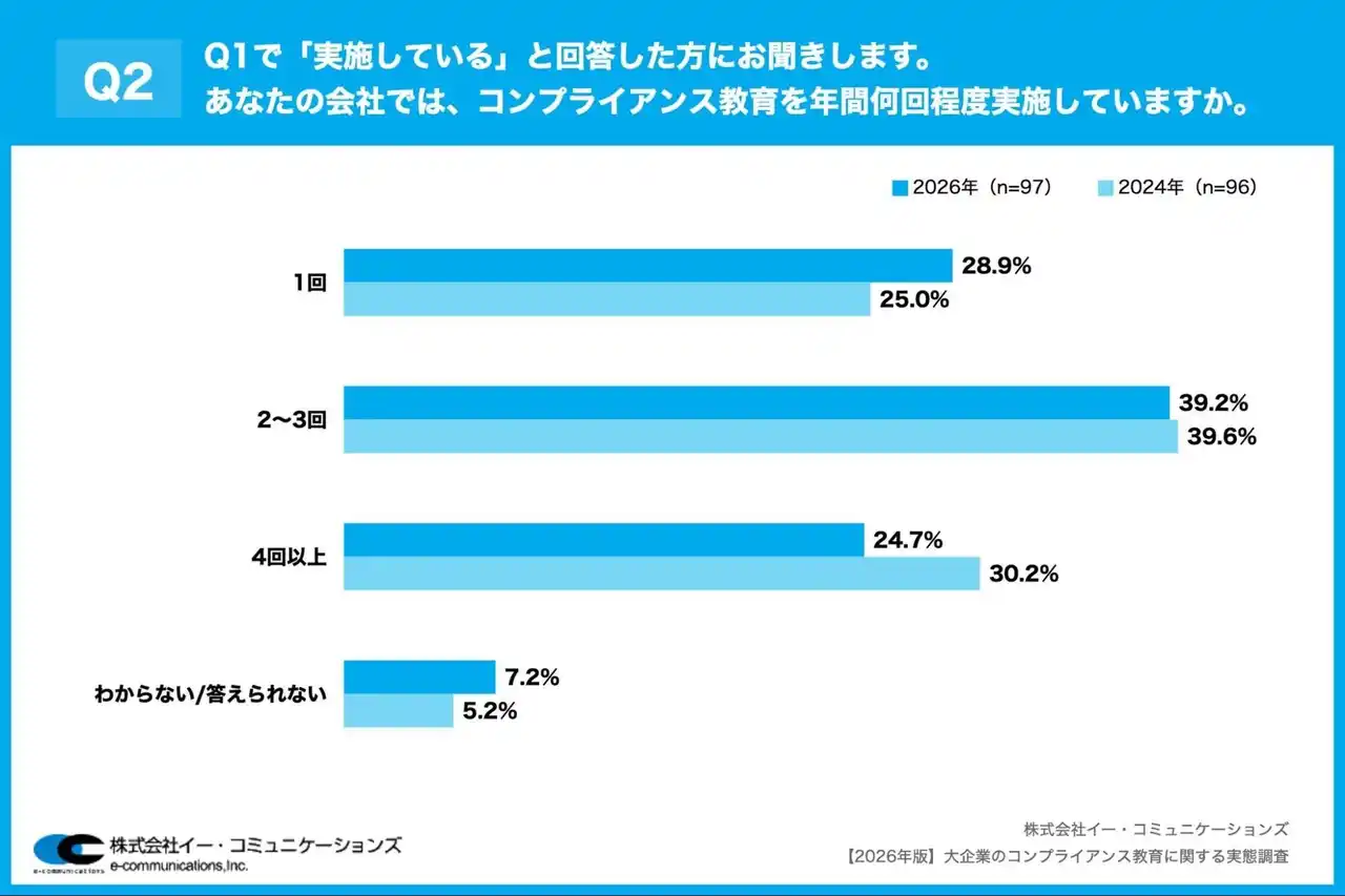 株式会社イー・コミュニケーションズ(本社:東京都港区、代表取締役:佐藤信也)は、大企業(従業員数1,000名以上)の経営者・役員108名を対象に、【2026年版】大企業のコンプライアンス教育に関する実態調査を実施しましたので、お知らせいたします。