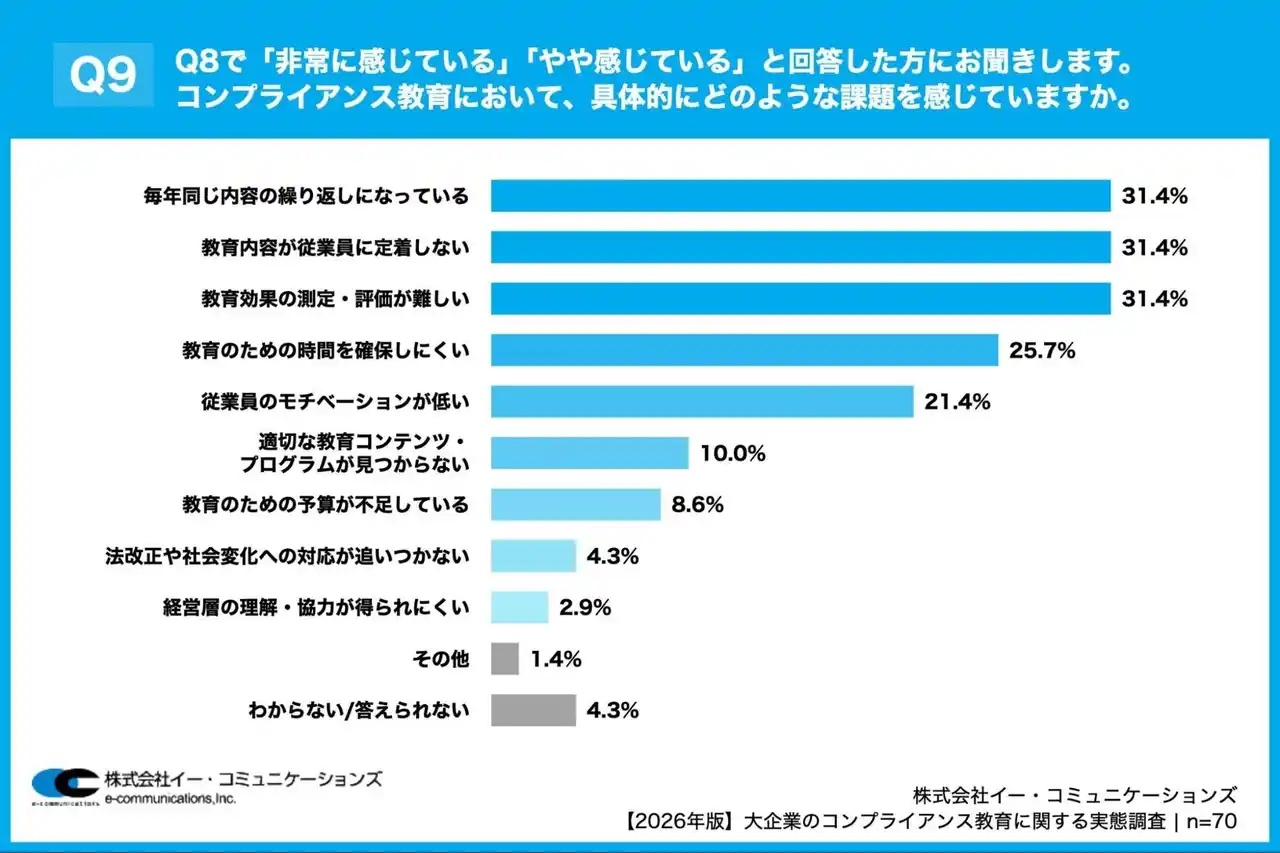 「Q9. Q8で「非常に感じている」「やや感じている」と回答した方にお聞きします。コンプライアンス教育において、具体的にどのような課題を感じていますか。(複数回答)」(n=70)と質問したところ、「毎年同じ内容の繰り返しになっている」が31.4%、「教育内容が従業員に定着しない」が31.4%、「教育効果の測定・評価が難しい」が31.4%という回答となりました。 |