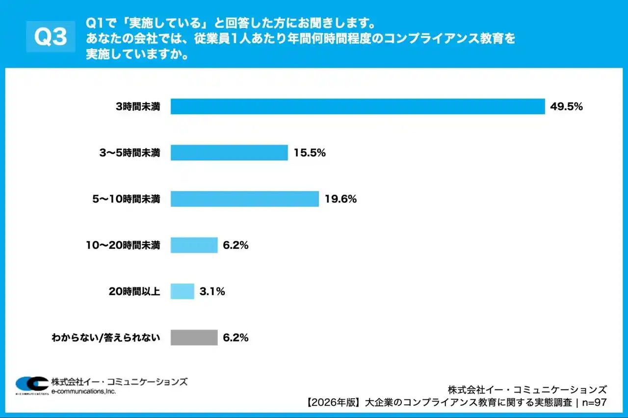「Q3. Q1で「実施している」と回答した方にお聞きします。あなたの会社では、従業員1人あたり年間何時間程度のコンプライアンス教育を実施していますか。」(n=97)と質問したところ、「3時間未満」が49.5%、「3~5時間未満」が15.5%という回答となりました。 |
