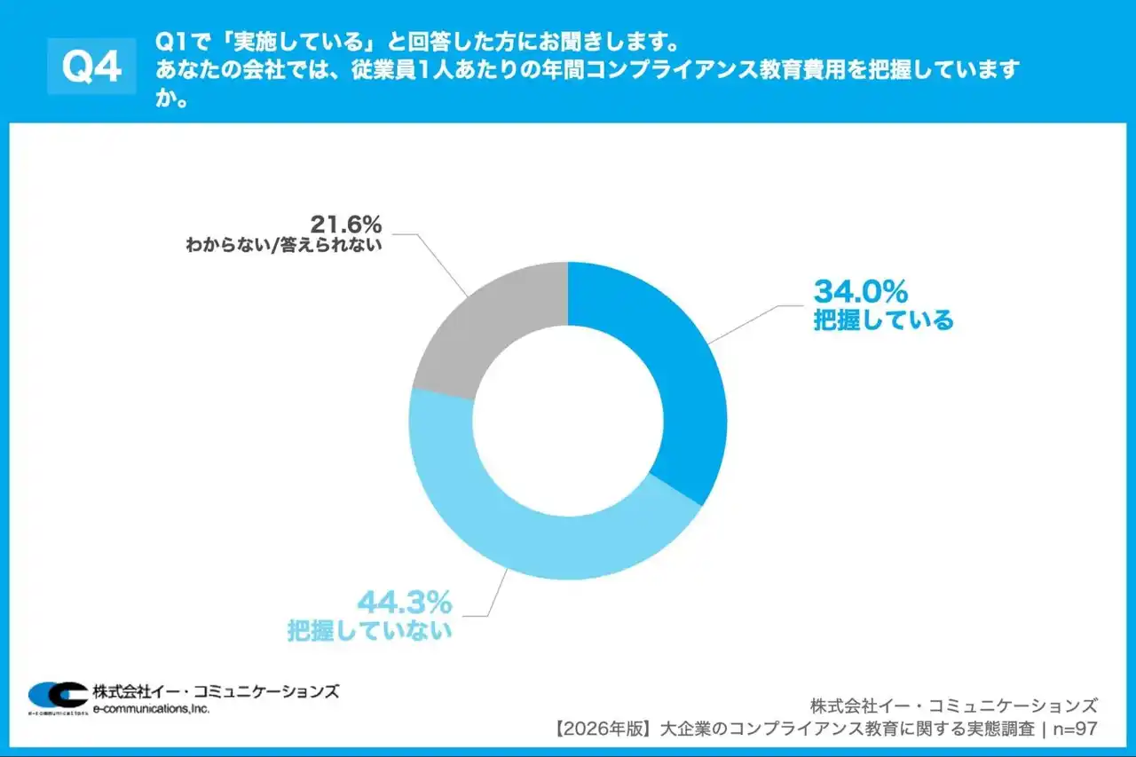 「Q4. Q1で「実施している」と回答した方にお聞きします。あなたの会社では、従業員1人あたりの年間コンプライアンス教育費用を把握していますか。」(n=97)と質問したところ、「把握している」が34.0%、「把握していない」が44.3%という回答となりました。 |