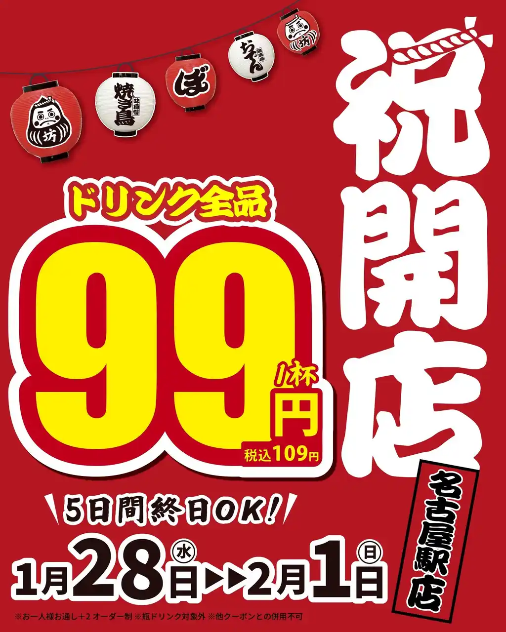 株式会社double(本社:大阪府大阪市北区/代表取締役:松井 勝也/以下、ダブル)は、2026年1月28日(水)に「焼き鳥おでん 坊っちゃん 名古屋駅南口店」をオープンします。オープン記念として、1月28日から2月1日の5日間終日ドリンク全品99円(税込109円)のキャンペーンを開催します。(https://www.instagram.com/p/DTKY4U_CZZG/)