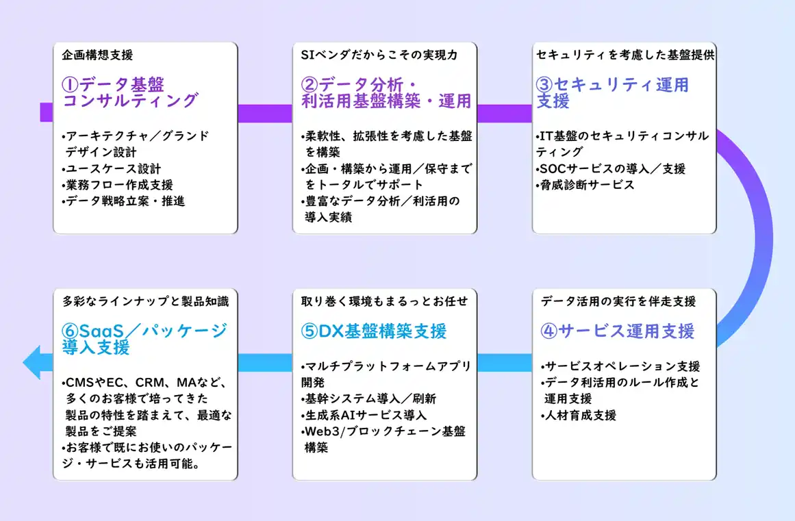 データ分析・利活用プラットフォームの導入を、戦略立案から構築、運用に至るまでトータルでサポート。データに基づく迅速な経営判断と的確な意思決定を支援し、顧客生涯価値(LTV)の最大化を目指します。 |