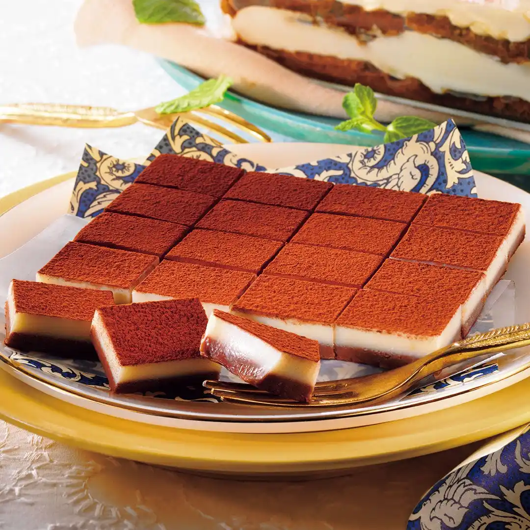 イタリアで生まれたデザート「ティラミス」をイメージした生チョコレート。マスカルポーネチーズのパウダーを入れたホワイトチョコレートのガナッシュと、コーヒーとコーヒーリキュール入りのガナッシュを2層に重ね、ココアパウダーをかけました。チーズのコクとコーヒーの味わいが、それぞれ引き立ちながらもとけ合い、まるでティラミスを食べているかのような風味が広がります。 |