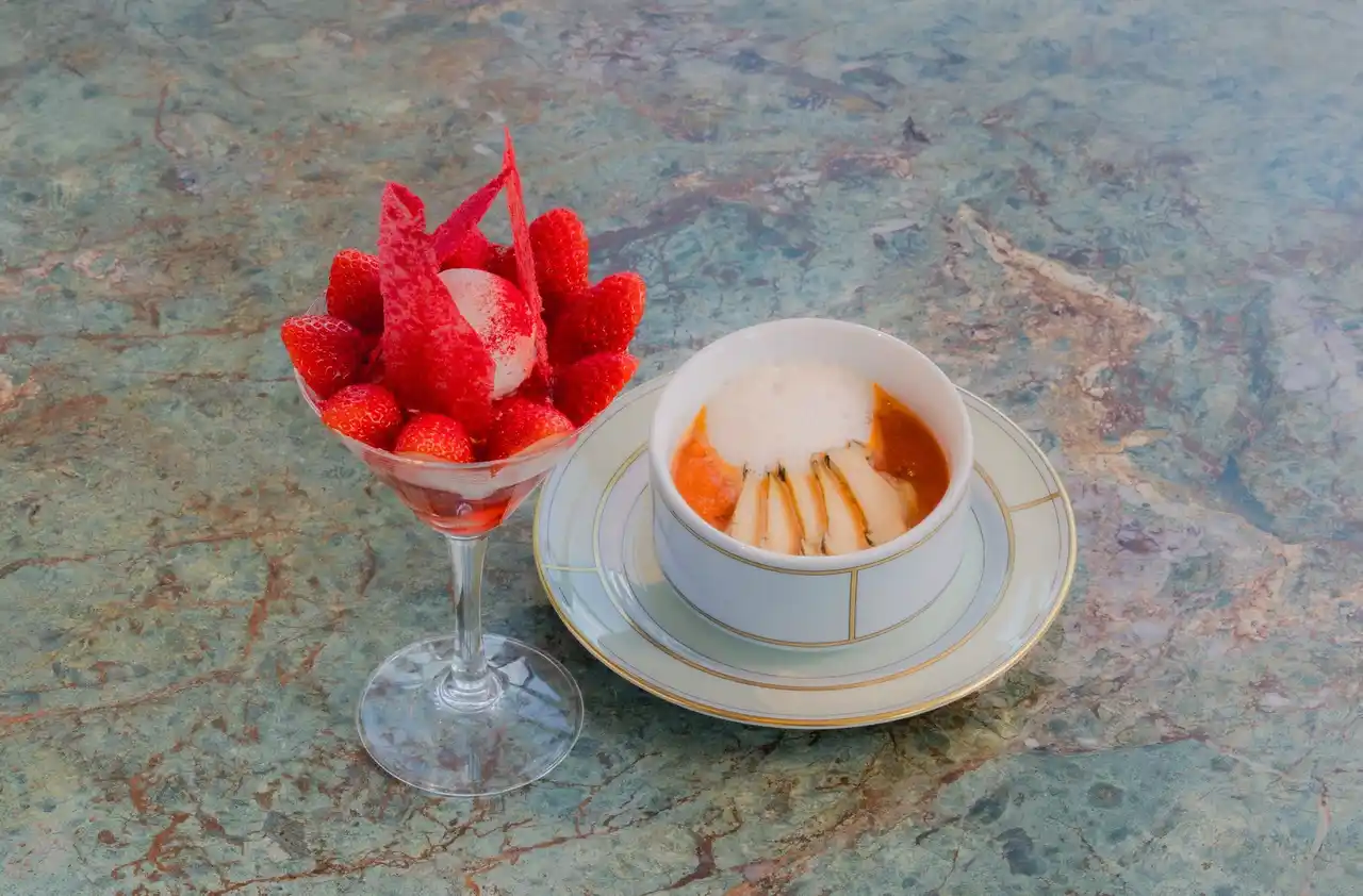 | マンハッタンスタイルの赤いクラムチャウダーに、白いクラムチャウダーのふわりとした泡を重ね、二つの表情を一度に楽しめる贅沢な一品。深みとコクが溶け合う味わいに、ふっくら柔らかく仕上げたあわびを添え、スープでありながらひと皿の料理として完成された存在感を放つ「赤と白のクラムチャウダー」。グラスの中で苺が宝石のようにきらめく「真紅のクープ 減圧苺とソワニエシャンティー」は、香りと甘酸っぱさが際立つよう、減圧によって果実感を閉じ込めた苺をたっぷり使用し、軽やかさの中にリッチなコクが潜む特製クリームと共に味わうスペシャルパフェ。真紅のグラスに春の気配を閉じ込めたような、甘美で艶やかなひと品です。 | |||||||||