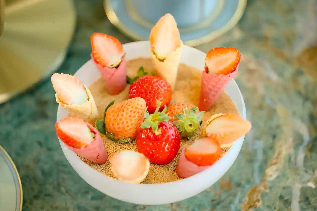 心躍るパスアラウンドの演出。お席へお届けする2種類の「苺のプティ・コルネ」