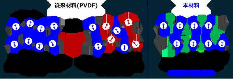 | 圧電材料とは、外部から力(応力や振動)を加えると電圧を発生する材料で、マイクや歪みセンサー2)などに使用されています。主に、ポリフッ化ビニリデン(PVDF)やチタン酸ジルコン酸鉛(PZT)が用いられていますが、PVDFは120℃で分極構造3)を失い圧電性が喪失するため、使用温度の上限は80℃程度です。また、PZTなどの無機圧電材料は、圧電性が高い一方で硬く脆いため、複雑形状や大面積での搭載が困難でした。 | |||