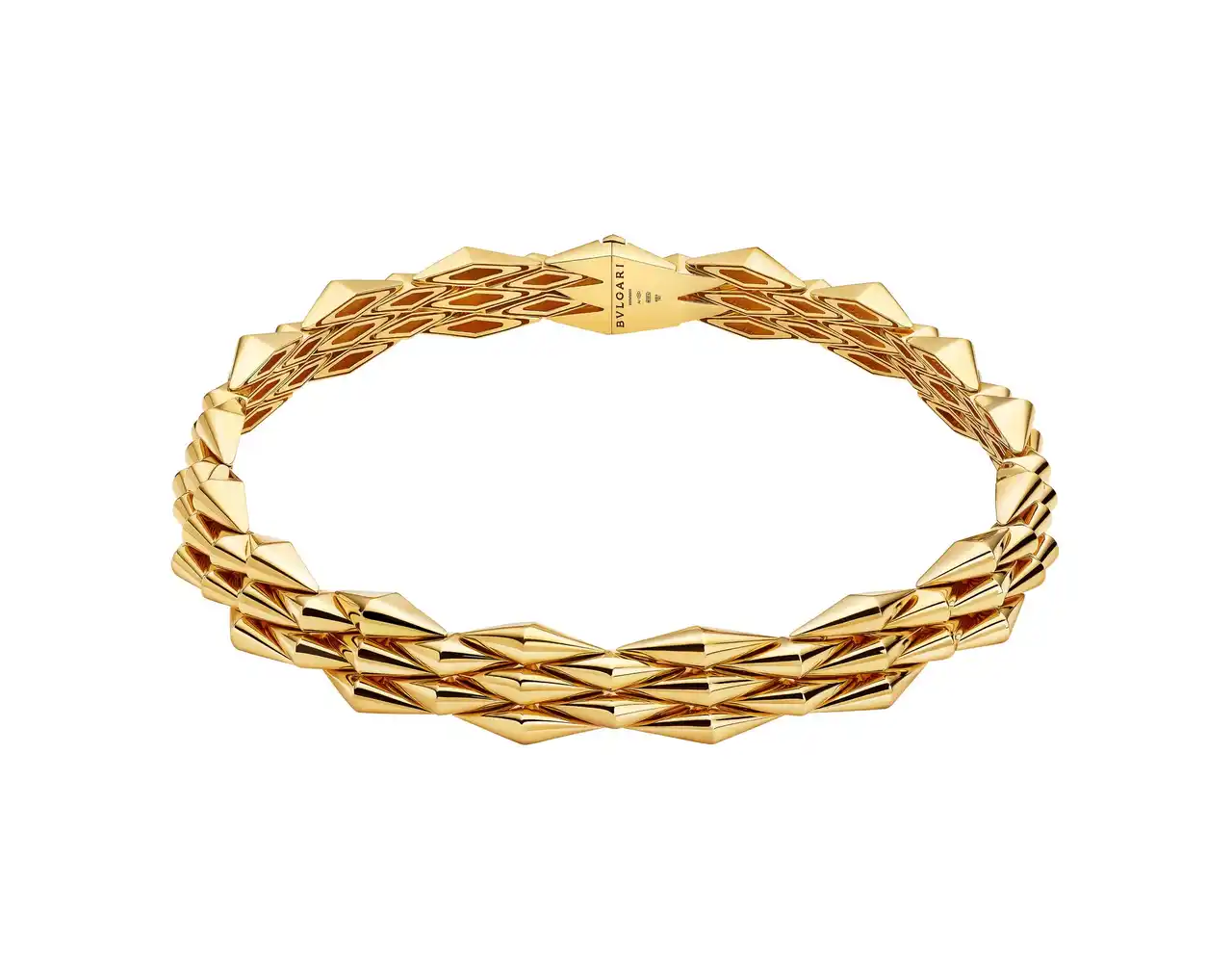 このコレクションの中心となるブレスレットは、アーカイブのジュエリーからインスピレーションを得ており、息をのむような職人技のレベルへと昇華されています。黄金の波が手首を包み込み、ひし形の要素が肌に完璧な調和をもたらします。それらは、目に見えない柔軟なリンクによって固定されています。時代を超越した魅力を帯びた現代的な大胆さは、ブルガリの本質そのものであるスタイルを再定義します。 |