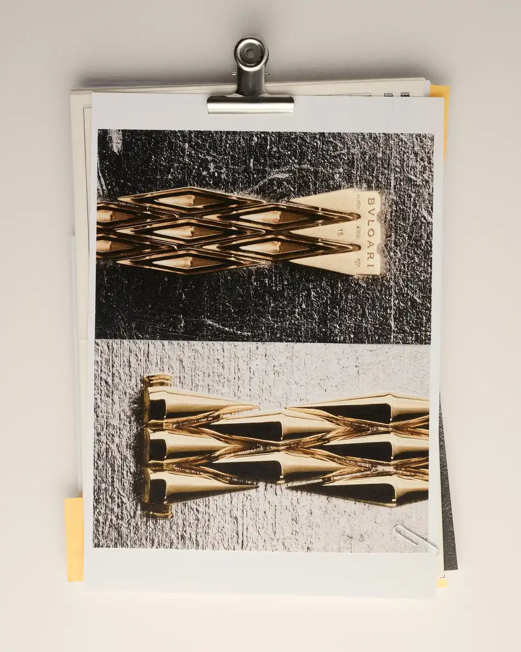 第二次世界大戦によって素材や社会的な制約があった時代に誕生したこのオリジナル作品は、あらゆる障壁を打ち破る無限の創造性の証です。イタリア合理主義の本質から着想を得た波打つようなモチーフは、ピンクゴールドとイエローゴールドの融合によって際立つリズミカルな反復で展開されます。これは、後にブルガリのスタイルを特徴づけることになる色彩のコントラストとモジュール式のデザインを体現するだけでなく、フランスのプラチナの伝統とは対照的に、メゾンを象徴する温かみのあるゴールドの使用を際立たせています。 |