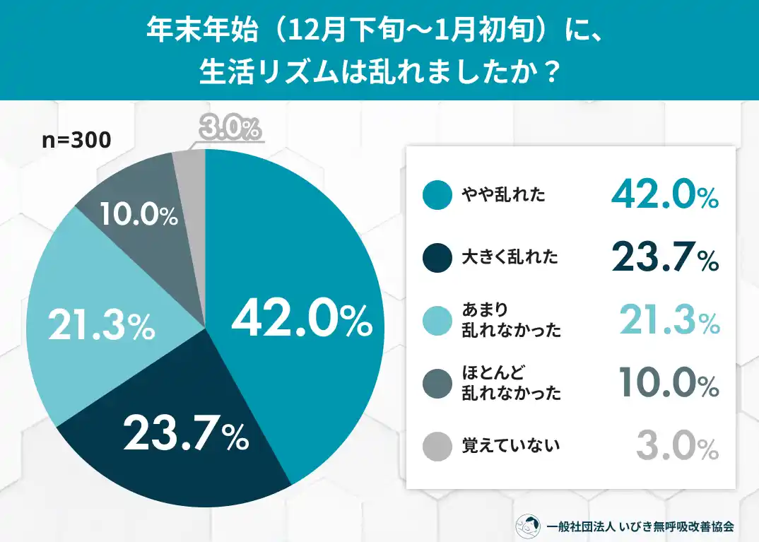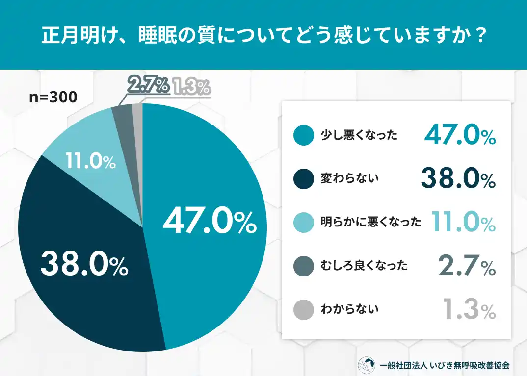 年末年始は、忘年会や新年会、夜更かし、食生活の乱れなど、日常とは異なる生活が続きやすい時期です。「正月明けに疲れが抜けない」「睡眠の質が落ちた気がする」と感じた人も多いのではないでしょうか。一般社団法人 いびき無呼吸改善協会では、年末年始に生活リズムが乱れた自覚のある20~60代男女300名を対象に、「正月明けの睡眠といびき」に関する調査を実施しました。その結果、約6割が睡眠の質の低下を実感し、3人に1人以上が年末年始にいびきの変化を感じている実態が明らかになりました。年末年始の“ちょっとした生活習慣の乱れ”が、睡眠やいびきにどのような影響を及ぼしているのか、調査結果から読み解きます。 |