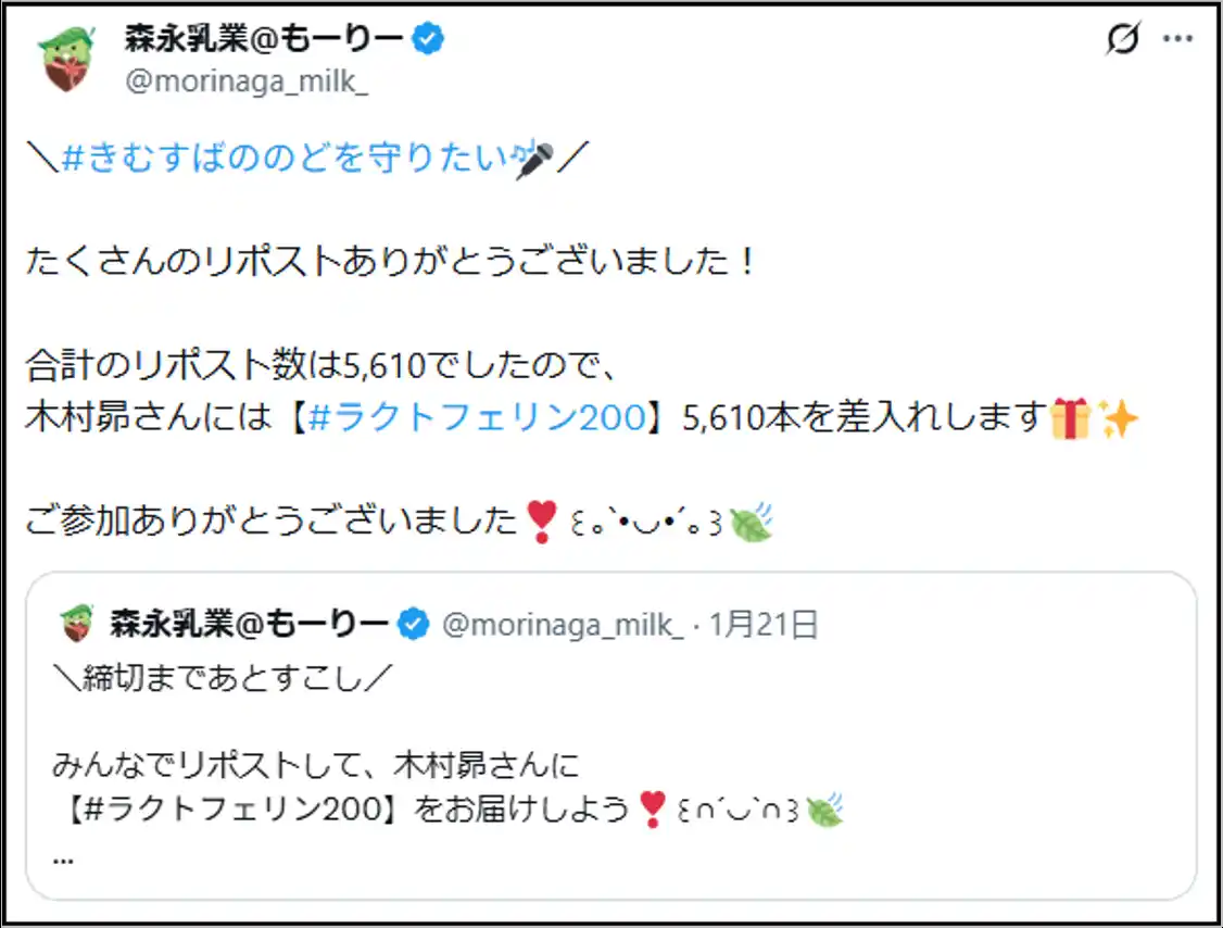「リポスト数」に応じて、その本数分の「森永ラクトフェリン200ドリンクタイプ」が木村昴さん本人に差し入れされる本キャンペーンに、木村昴さんの“のどを守りたい”という想いに共感した多くの方々がリポストを実施。さらに、木村昴さん本人もSNS上で反応し、「よかったらみんなもリポストして」といった趣旨の投稿で参加を呼びかけたことで、最終的に5,610のリポスト数(=差し入れ本数)が集まりました。 |