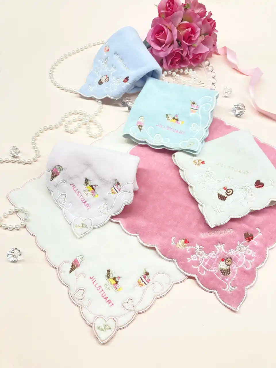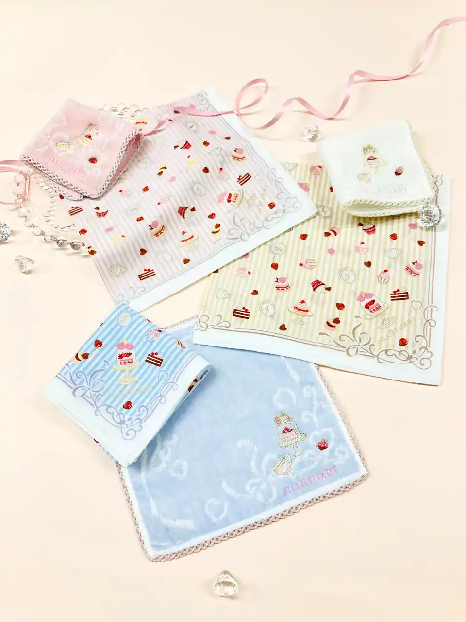 | ふんわりとした優しい肌触りのタオル地に、スイーツモチーフとアラベスクパターンを刺繍した心ときめくタオルハンカチ。ローズやハートのモチーフもさりげないアクセントとなっています。 | |||||||||