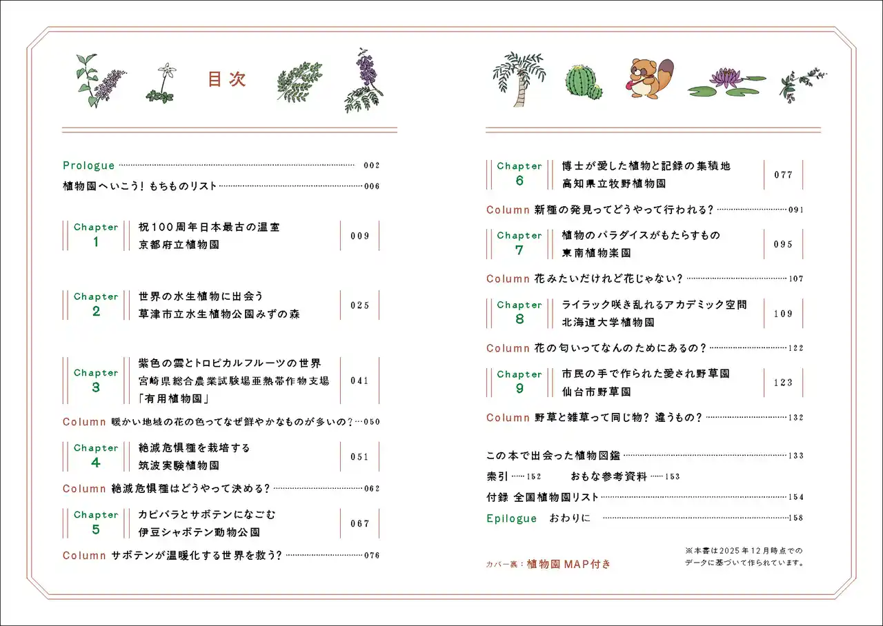 「ただ歩くだけ」だった植物園が、背景や意味を知ることで、また違った視点で学べる場所へと変わっていきます。巻末には、100種以上の植物を収録した植物図鑑を掲載。さらに、全国各地のおすすめ植物園をまとめたMAPも付属しており、実際の来園や旅の計画にも役立つ内容となっています。 |