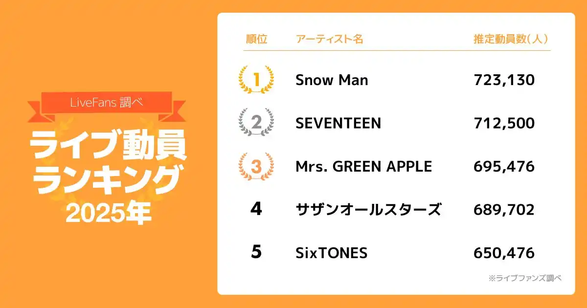 | そのLiveFansに登録されている「2025年に日本国内で開催されたライブ・コンサート」のデータをもとに、2025年のライブ・コンサートにおける動員力を独自に集計しランキング化。いま動員力のあるアーティストは一体誰なのか?を調査した結果を発表します。 | |||
