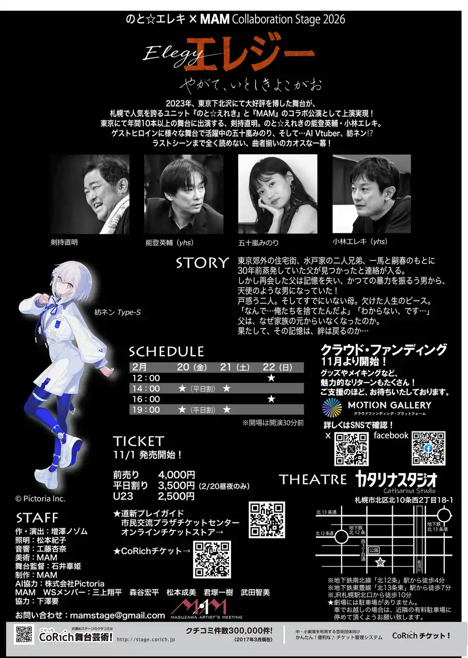 AI技術等のテクノロジーを活用したIP創出事業を展開する株式会社Pictoria(東京都港区、代表取締役CEO:明渡隼人、以下「Pictoria」)は、当社が開発・運営するAI VTuber「紡ネン Type-S」が、2026年2月20日(金)より上演される舞台「エレジー ~やがて、いとしきよこがお~」に出演することをお知らせします。 |