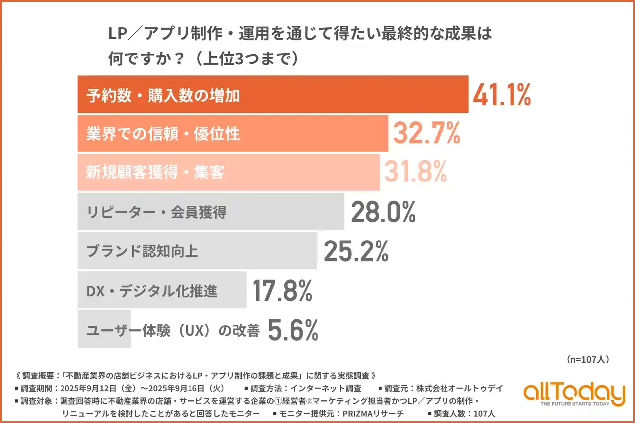 株式会社オールトゥデイ(本社所在地:埼玉県さいたま市)は、不動産業界の店舗・サービスを運営する企業の1.経営者2.マーケティング担当者かつLP/アプリの制作・リニューアルを検討したことがある方を対象に、「不動産業界の店舗ビジネスにおけるLP・アプリ制作の課題と成果」に関する実態調査を実施しましたので、その結果を公表します。
