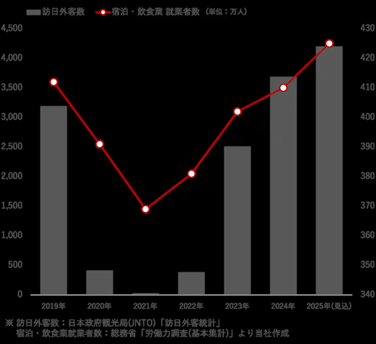 2019年から2021年にかけてのパンデミックにより訪日客が減少し、他業界への転職や雇用調整が進んだ結果、ホスピタリティ産業では熟練スタッフが大きく減少しました。その後、訪日客数が回復する一方で就業者数の回復は緩やかにとどまり、需要と供給のギャップが拡大しています。2026年には、パンデミック前と比較して一人当たりの業務負担が増加すると見込まれています。 |