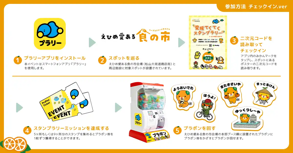 チェックインスポット5か所でスタンプを集めた参加者はプラポン券1枚を獲得し、本企画限定の景品として、ご当地キャラクター3体の「スペシャルステッカー」(全5種)と交換することができます。加えて、イベント内の対象ブースでのお買い物でプラポン券との引換券を獲得することも可能です。また、カプセルの中には、愛媛のかんきつ3種セットがプレゼントされる「あたり」も含まれています。 |
