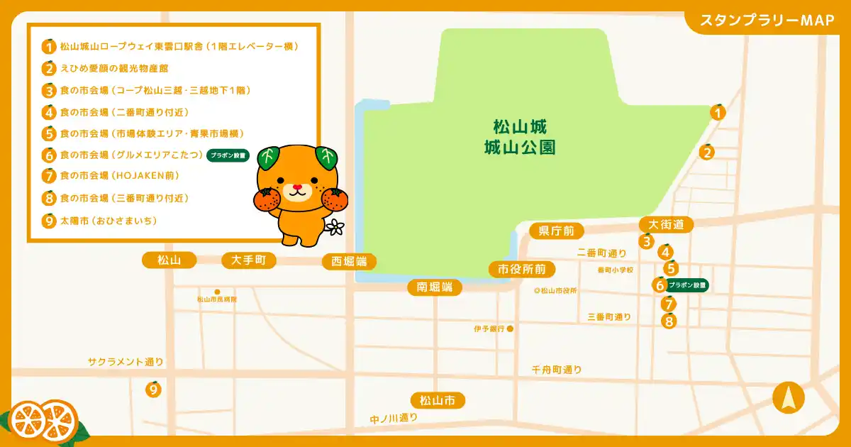 食の市会場(市場体験エリア・青果市場横、グルメエリアこたつ付近、HOJAKEN前、三番町通り付近、千舟町通り付近、コープ松山三越・三越地下1階)、太陽市(おひさまいち)、 松山城ロープウェイのりば、えひめ愛顔の観光物産館 |