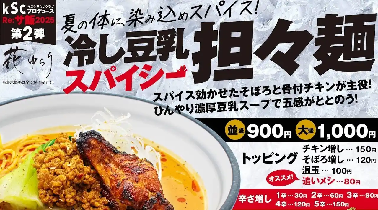 第2弾「濃厚豆乳冷やしスパイシー担々麺」 2025年7月1日より夏季限定で販売開始。数十種のカレースパイスを効かせた肉そぼろ、痺れる刺激の豆乳スープ、スパイシーな骨付きチキン、もちもち中太麺、夏野菜という“五感設計”で、暑い季節の食欲と回復をサポートする提案として展開しました。 |