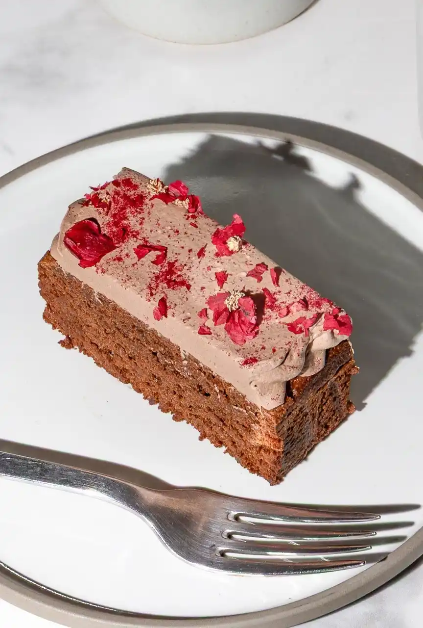 濃厚なチョコレートのコクを丁寧に引き出した、リッチで贅沢な味わいのオリジナルチョコレートケーキです。アーモンドの香ばしさとクリームの優しい甘さが、しっとりとなめらかな口当たりを引き立てます。なめらかなホイップクリームでアイシングし、色鮮やかなペタルとラズベリーパウダーをトッピング。気分も華やぐとっておきのスイーツです。 |