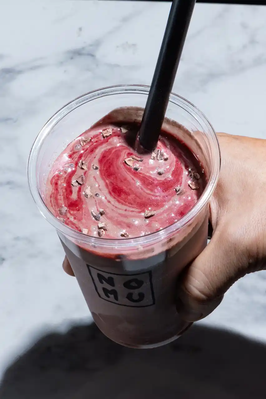 純ココアのほろ苦さに、ベリーの甘酸っぱさ、バナナとデーツの自然な甘みを重ねた濃厚なスムージーです。ココナッツミルクとアーモンドミルク、そしてギリシャヨーグルトでまろやかに仕上げ、アガベシロップで後味をやさしく整えました。仕上げにカカオニブとフランボワーズパウダーを振りかけ、香ばしさと華やかな酸味をプラスした、NOMU aoyamaの季節限定スムージーです。 |