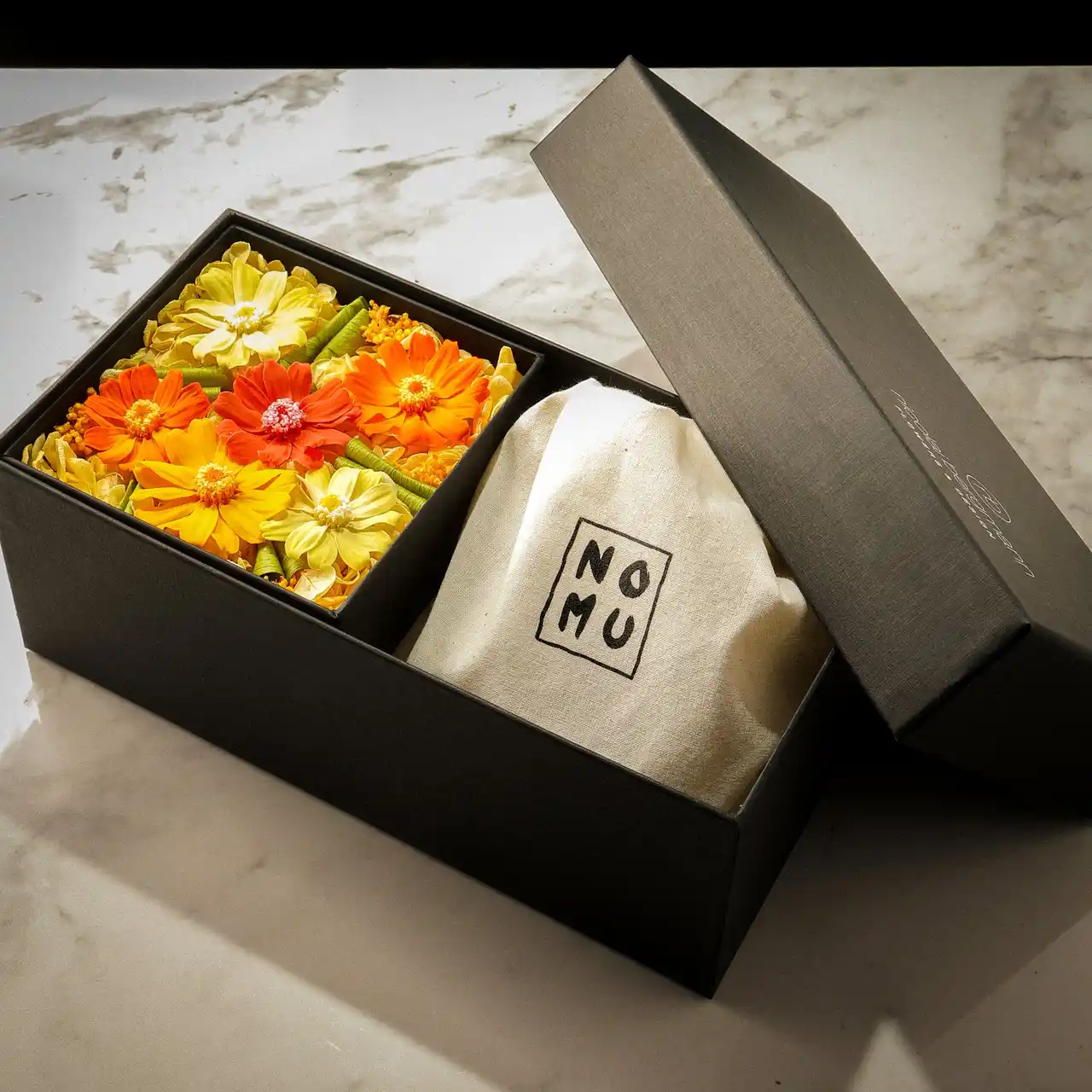 NOMUのロゴ入りコットン巾着に、個包装のキャラメル15個入り。個包装のため、ご自分へのご褒美はもちろん、ご家族やおともだち、オフィスなど、あらゆるシーンでみなさんでお楽しみいただけます。 |