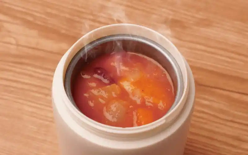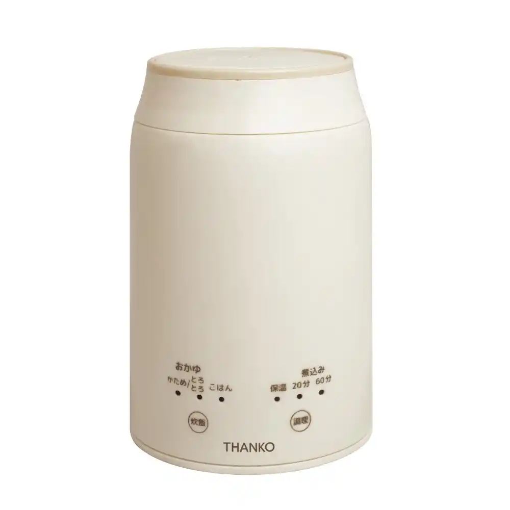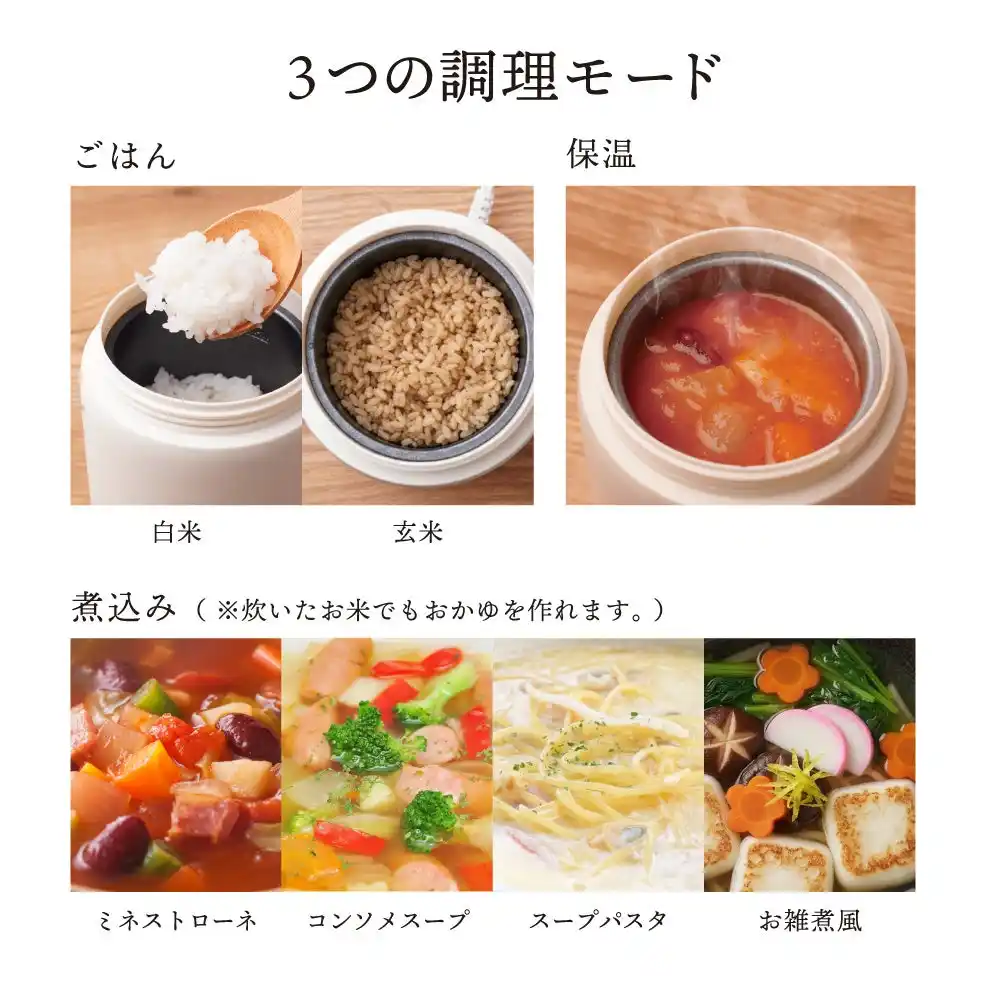 まるでスープジャーのような見た目ですが、実際はヒーターを内蔵し、コンセントに繋いでグツグツと加熱調理ができる「持ち運べる炊飯器」そのもの。 |