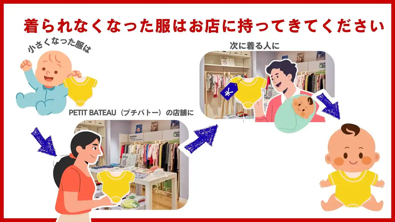 「#プチバトン」は、2022年11月よりスタートした、プチバトーの回収・買い取りプログラムです。国内10店舗の回収拠点にて、お客様の着なくなったプチバトーアイテムの回収・買い取りを行い、再販またはリサイクルを通じて服の循環を実践しています。 |