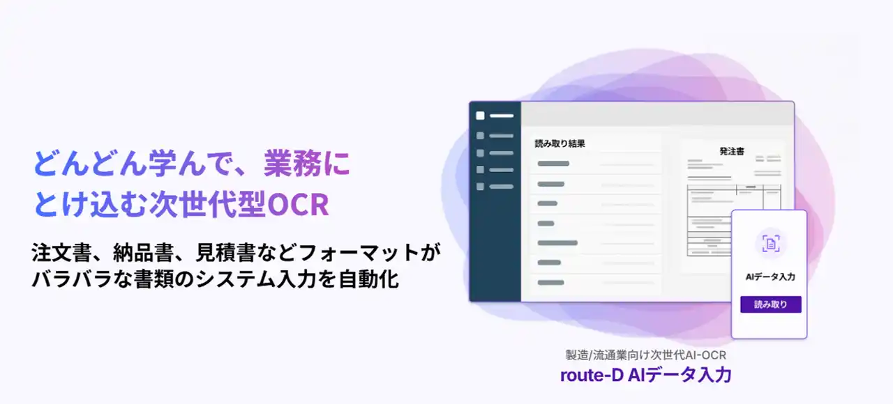 その第一弾として "どんどん学んで業務にとけ込む次世代型のOCR"「route-D AIデータ入力」を2025年にローンチし、既に50社以上との取り組みが進捗しております。また導入企業では、これまで人間が実施してきた入力業務の工数を90%削減し、人間は人間にしかできないコア業務に専念することができています。 |