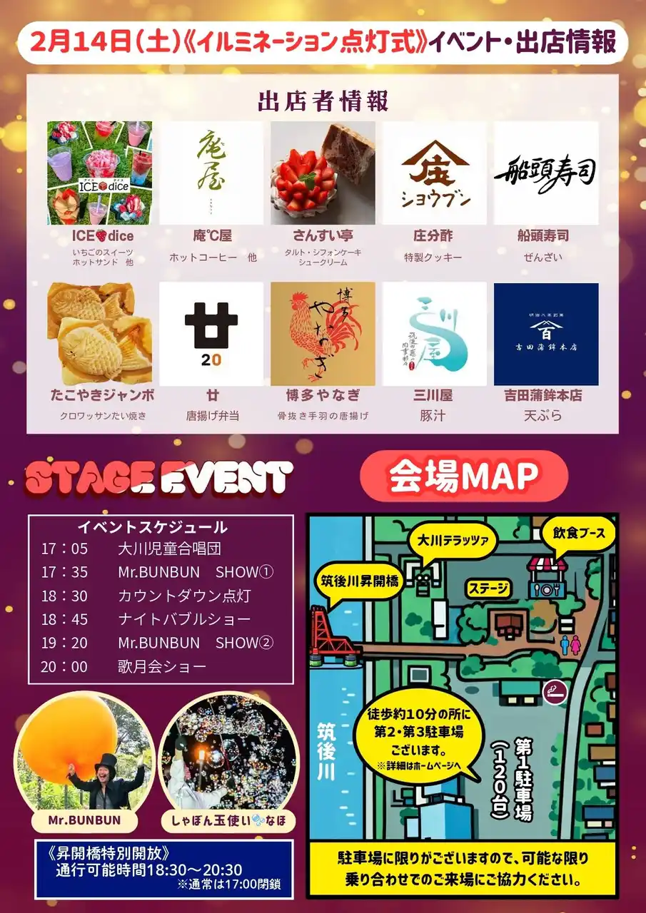 市のシンボル「筑後川昇開橋」のたもとに位置する筑後川昇開橋展望公園にて、大川の夜を彩るイルミネーションを実施します。 初開催となる今回は、数多くのLEDライトが公園一帯を幻想的に包み込み、新たな夜の魅力を創出します。 2月14日には点灯式イベントを開催し、ステージショーやグルメ出店など、訪れる皆さまにお楽しみいただける企画を予定しています。 ご家族やご友人、大切な方とともに、光に彩られた特別なひとときをぜひお楽しみください。 |