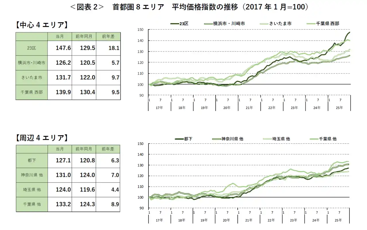 エリア別の前月比では、8エリア中6エリアが上昇した。中でも東京都下は11カ月連続、横浜市・川崎市は10カ月連続の上昇となっている。また、前年同月比では全8エリアが9カ月連続で上昇しており、首都圏全体として上昇基調を維持している。 |