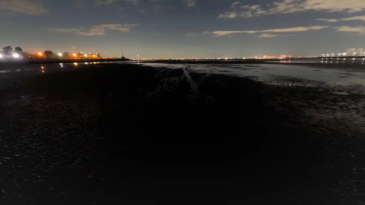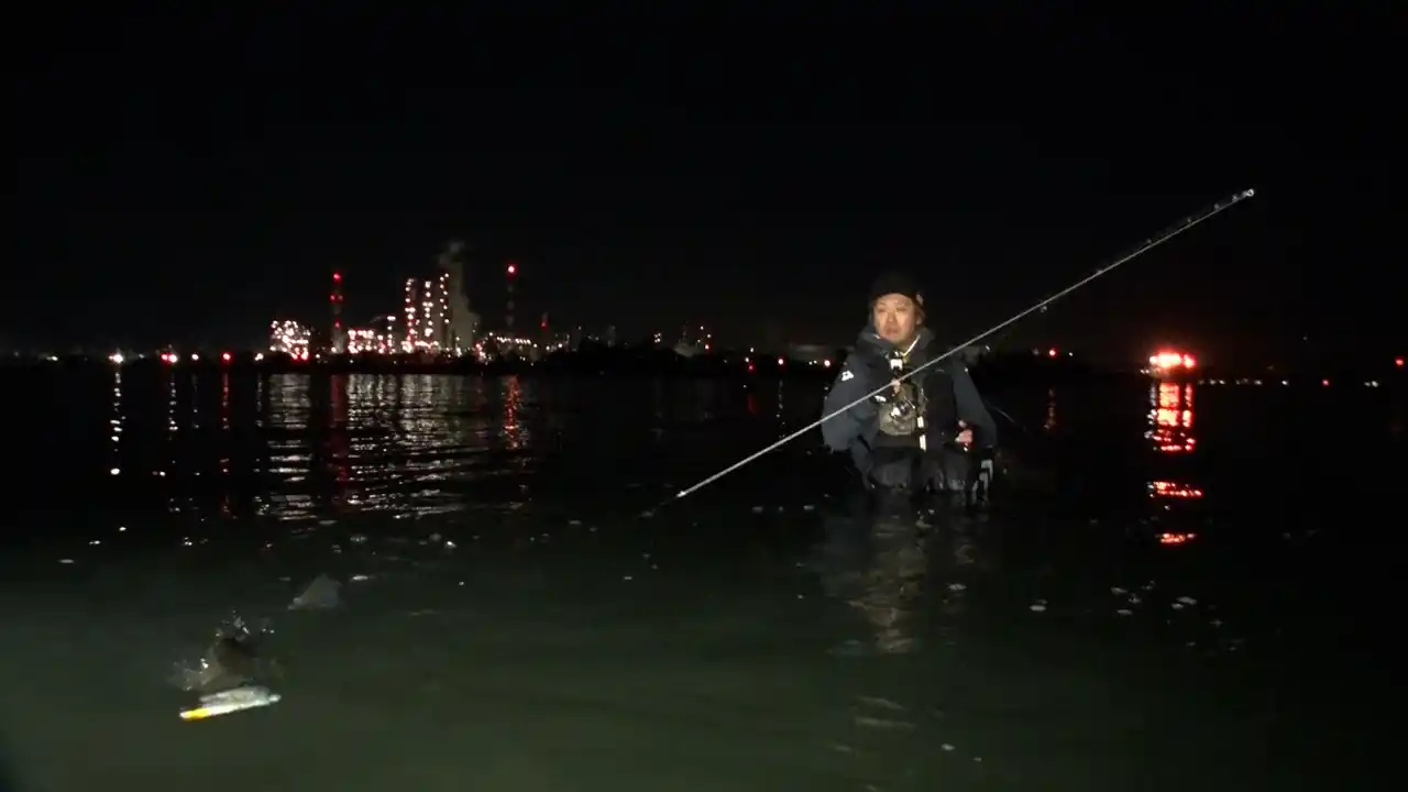 午後10時、気温3℃。大潮の干潮のタイミングを狙いすまし、東京湾に出撃。海に腰まで浸かり、同じ目線で魚と対峙する厳寒のウェーディングシーバス。 |