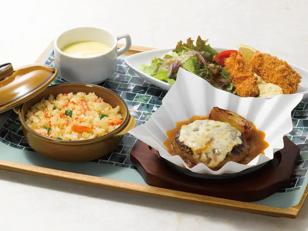 蟹ピラフ&オニオングラタンハンバーグ&真鱈フライ(北海道産コーンのポタージュ付) 3,480円(税込3,828円) |