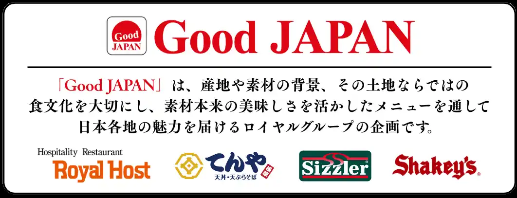 「Good JAPAN」は、産地や素材の背景、その土地ならではの食文化を大切にし、素材本来の美味しさを活かしたメニューを通して日本各地の魅力をお届けするロイヤルグループの企画です。今回は、冬の終わりから春の兆しを感じるこの時期に、北海道が育んだ豊かな恵みを、ロイヤルホストが50年以上に渡り培ってきた洋食の知見と、受け継がれてきた調理技術で仕立て、ご提供いたします。 |