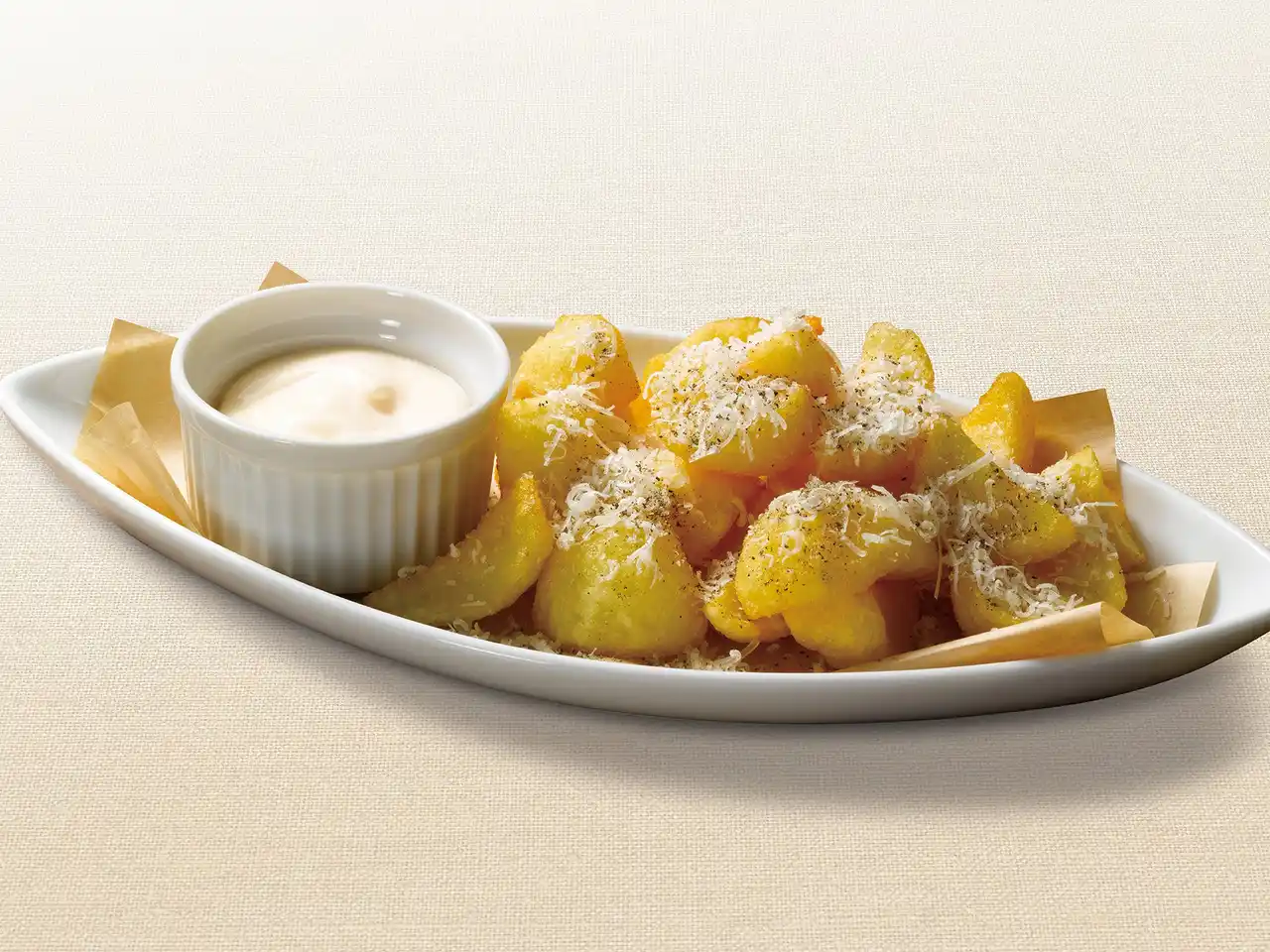 ほくほくとした食感と自然な甘みが特徴の北海道産きたあかりをシンプルに素揚げしてフライドポテトにし、塩、ブラックペッパー、パルミジャーノ・レッジャーノをかけました。お好みでアイオリクリームソース(ガーリックマヨネーズ)をつけてお楽しみください。 |
