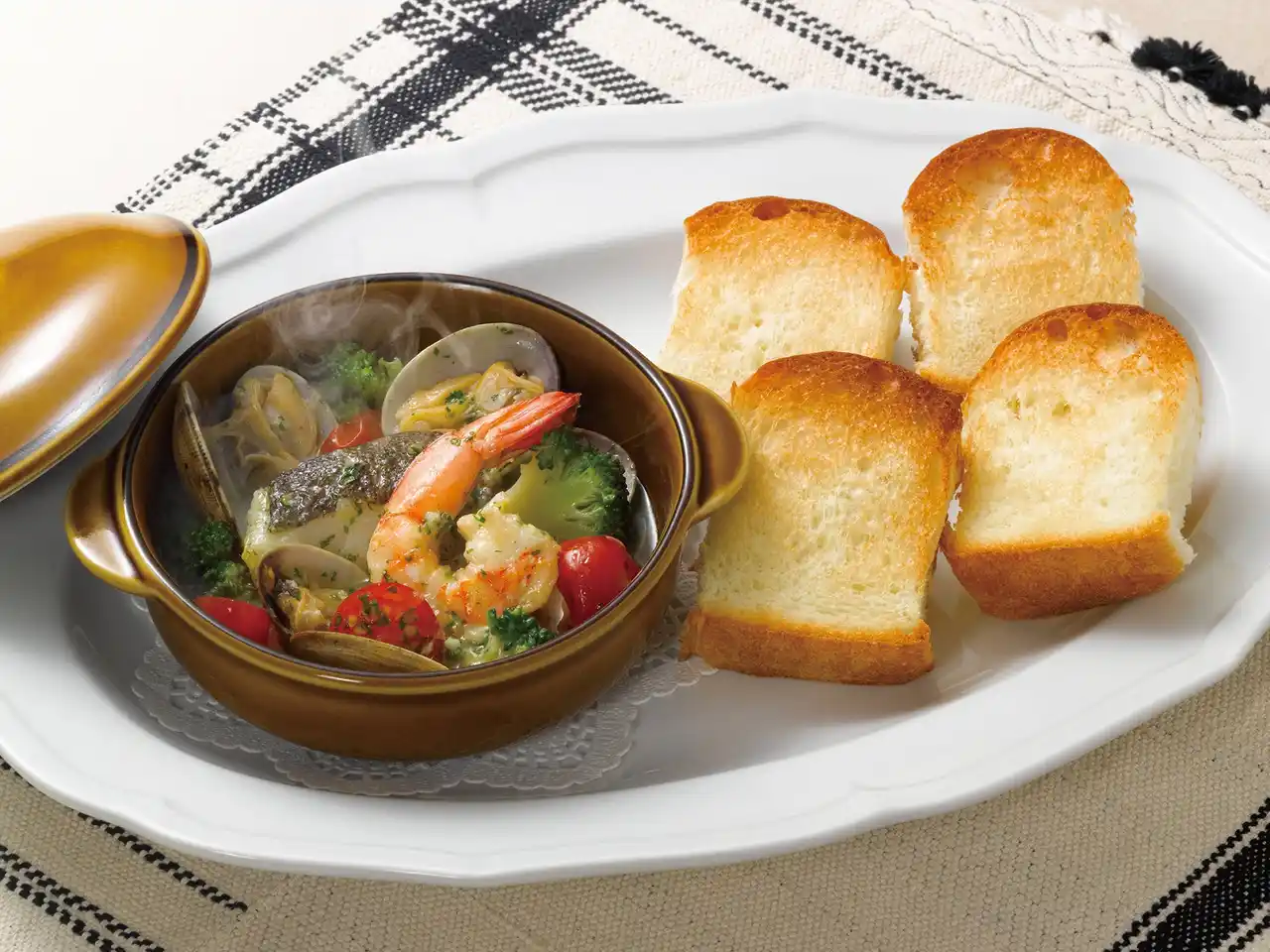 北海道産真鱈・厚岸(あっけし)産あさりや海老をアクアパッツァ仕立てにしました。北海道が育んだ魚介の旨みを存分に味わっていただけます。自社のセントラルキッチンで焼き上げたロイヤルホスト自慢のパンをスープにひたしてもお楽しみいただけます。 |