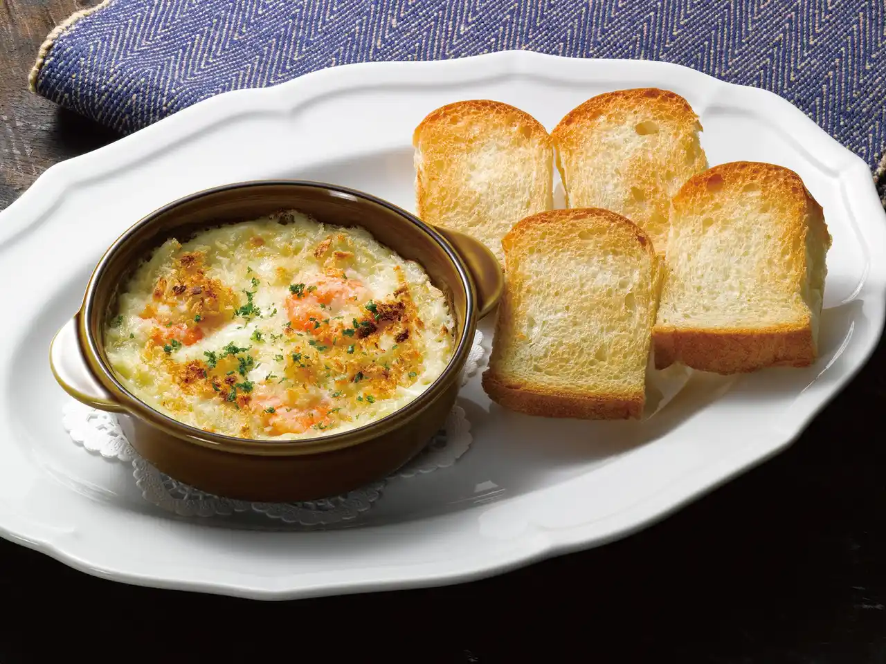 北海道産きたあかりのマッシュポテトに、北海道産真鱈と、海老を合わせ、グリュイエールチーズとパルメザンチーズをかけてこんがりと焼き上げたグラタンです。マッシュポテトはきたあかりの食感を楽しんでいただくために店舗で丁寧にマッシュし、牛乳やバターを合わせて仕上げています。北海道が育んだ、きたあかりと真鱈の美味しさをロイヤルホスト自慢のパンと共にお楽しみください。 |