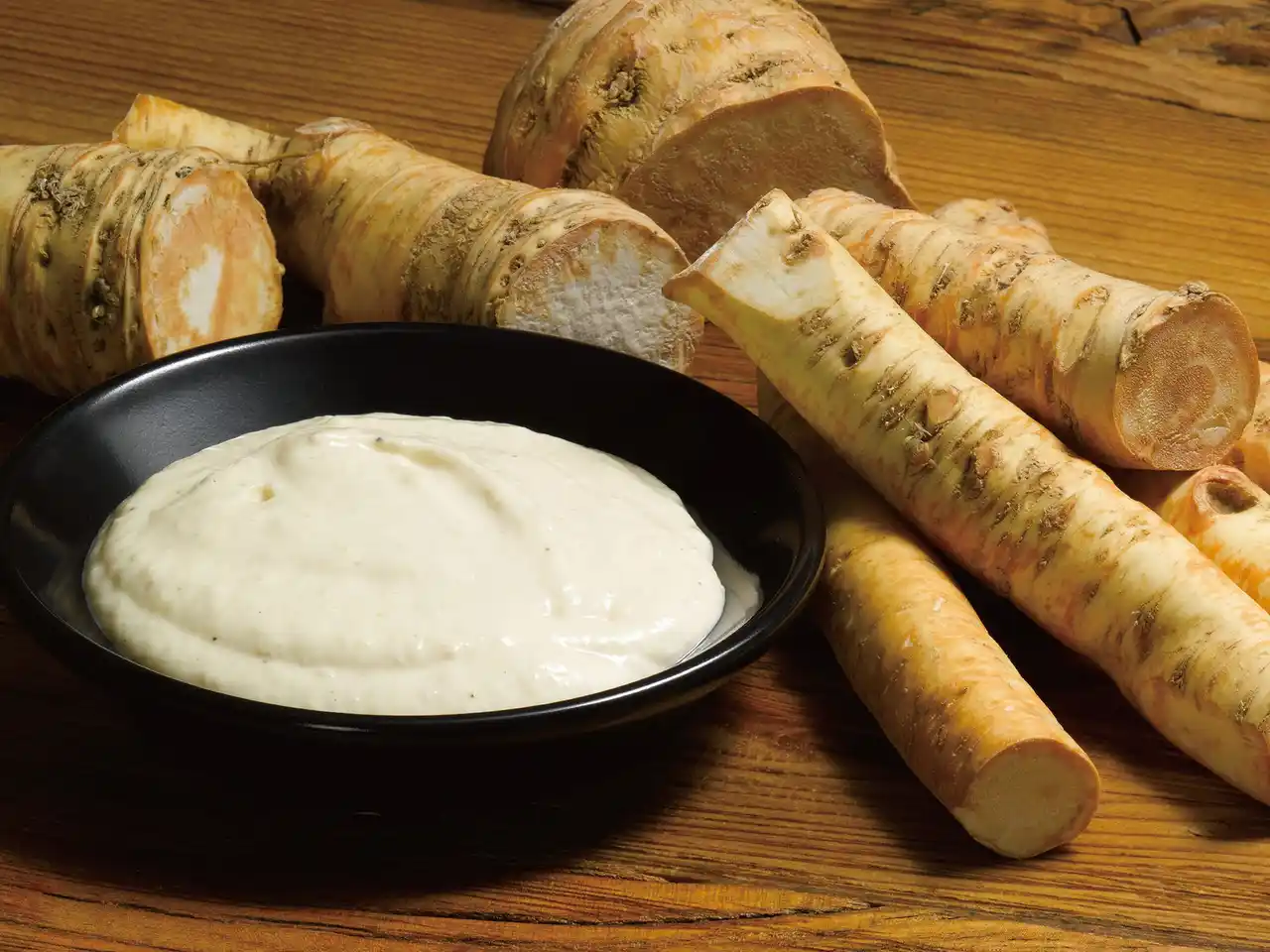 本わさびより辛味が強く爽快な味わいです。店内厨房でマヨネーズと生クリームを合わせてクリーミーなソースに仕立てます。ステーキとご一緒にお楽しみください。 |